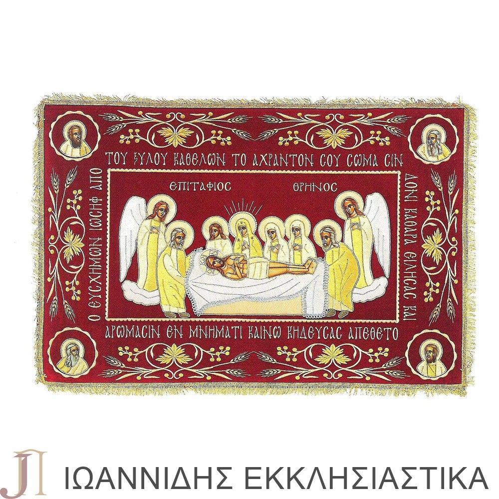 ΕΠΙΤΑΦΙΟΣ ΚΕΝΤΗΤΟΣ ΕΙΝΑΙ ΚΑΤΑΛΛΗΛΟ ΥΦΑΣΜΑ ΜΕ ΚΕΝΤΗΜΕΝΟ ΤΟΝ ΧΡΙΣΤΟ ΝΕΚΡΟ, ΟΠΩΣ ΗΤΑΝ ΜΕΤΑ ΤΗΝ ΑΠΟΚΑΘΗΛΩΣΗ. ΑΡΓΟΤΕΡΑ ΣΤΟΝ ΕΠΙΤΑΦΙΟ ΠΡΟΣΤΕΘΗΚΑΝ ΓΥΡΩ ΑΠΟ ΤΟΝ ΧΡΙΣΤΟ Η ΠΑΝΑΓΙΑ Ο ΙΩΣΗΦ Ο ΝΙΚΟΔΗΜΟΣ Ο ΙΩΑΝΝΗΣ ΟΙ ΜΥΡΟΦΟΡΕΣ ΚΑΙ ΟΙ ΑΓΓΕΛΟΙ ΣΕ ΕΠΙΤΑΦΙΟ ΘΡΗΝΟ.